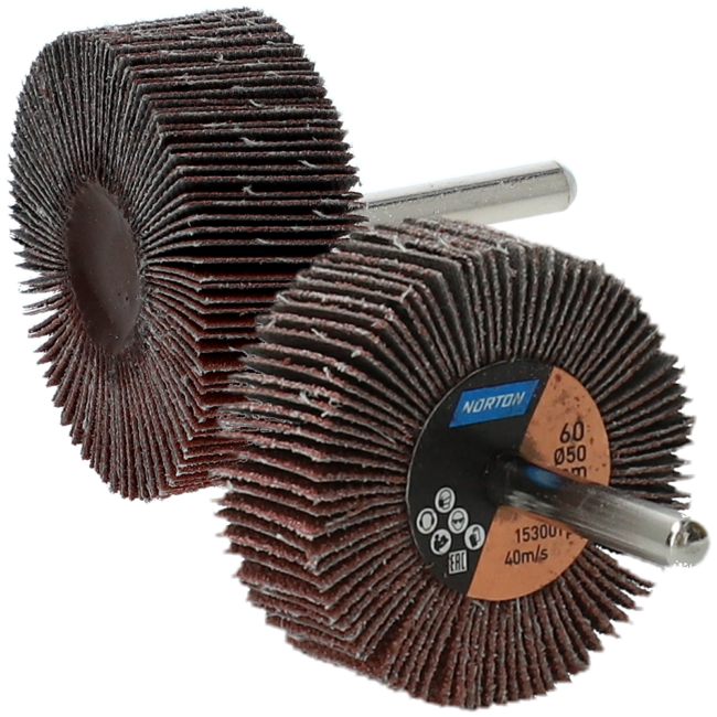 Made w / 6mm spindle, Cotton back w / Aluminum oxide abrasive grain, max. 5,700-9,500 rpm