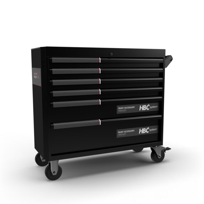 The Paint Accessory Trolley is a fully equipped mobile workstation designed for efficient and professional automotive spot repair and paint refinishing. Built around a robust cabinet, it includes a comprehensive selection of high-quality tools and consumables for surface preparation, masking, mixing, and spraying.